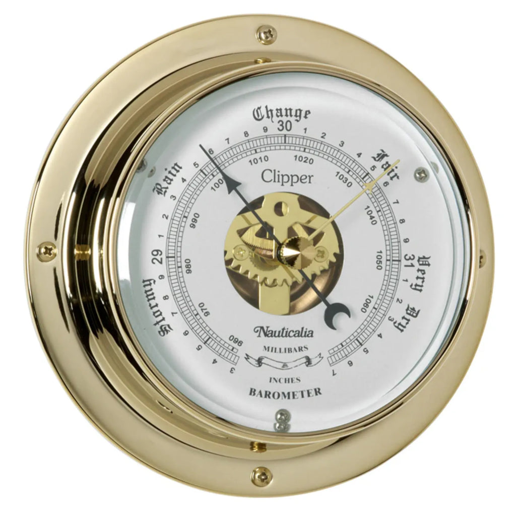 These instruments have brass cases with super durable, tarnish-free coating and QuickFix fitting system (see explanation below). Case diameter 4.5", depth 1.75". Quartz clock movements use one AA battery.