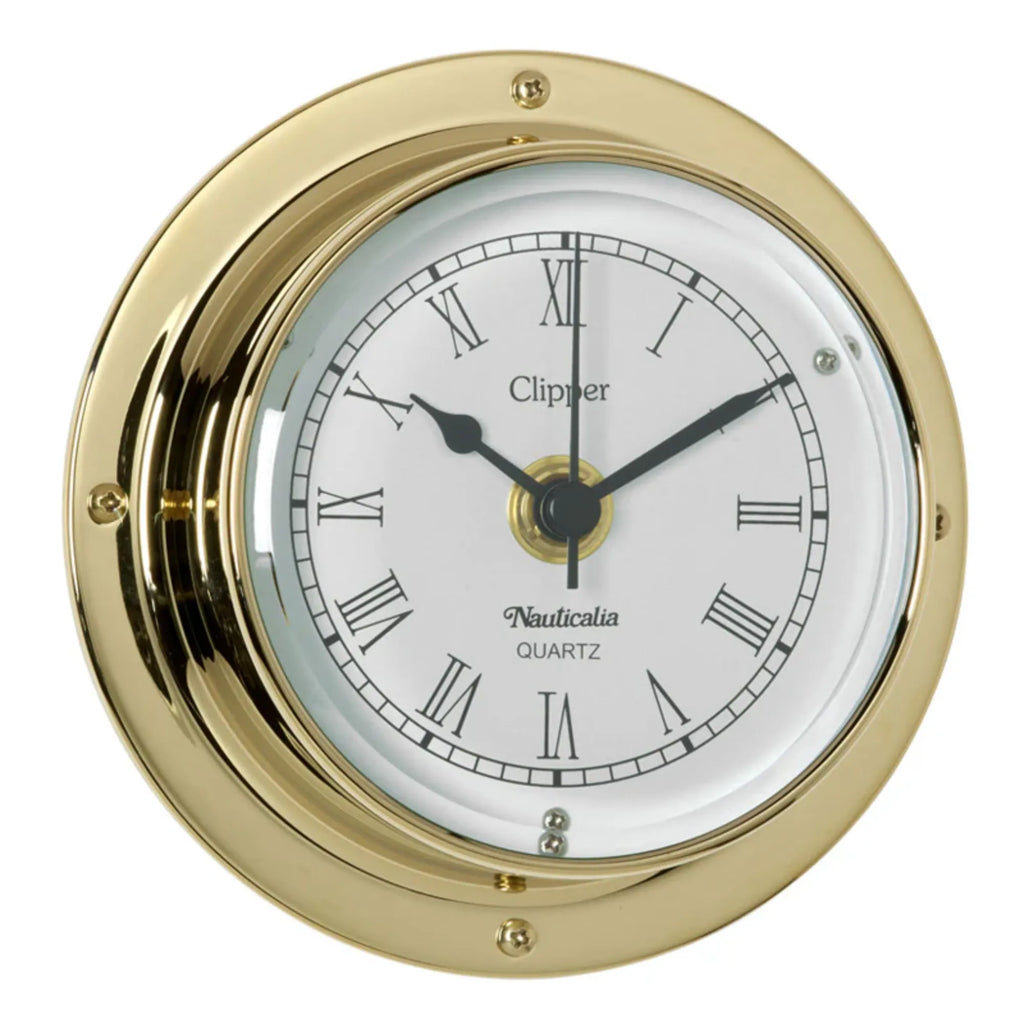 These instruments have brass cases with super durable, tarnish-free coating and QuickFix fitting system (see explanation below). Case diameter 4.5", depth 1.75". Quartz clock movements use one AA battery.
